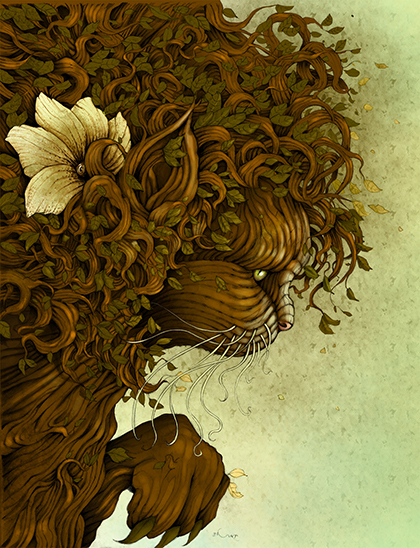 Dante Lividini, Catnip © Dante Lividini. Forests play a prominent role in many folktales and legends. In these dark, mysterious places, heroes can lose their way, face unexpected challenges, and stumble on hidden secrets. And trees appear as ladders between worlds, as sources of life and wisdom, and as the physical forms of supernatural beings –Nature Spirits were thought to inhabit trees and forests. The mythology of early India, preserved in texts called the Upanishads, includes a cosmic tree called Asvattha. It is the living universe, an aspect of ‘Brahman,’ the World Spirit. This Cosmic Tree reverses the usual order. Its roots are in the sky, while its branches grow downward to cover the Earth.